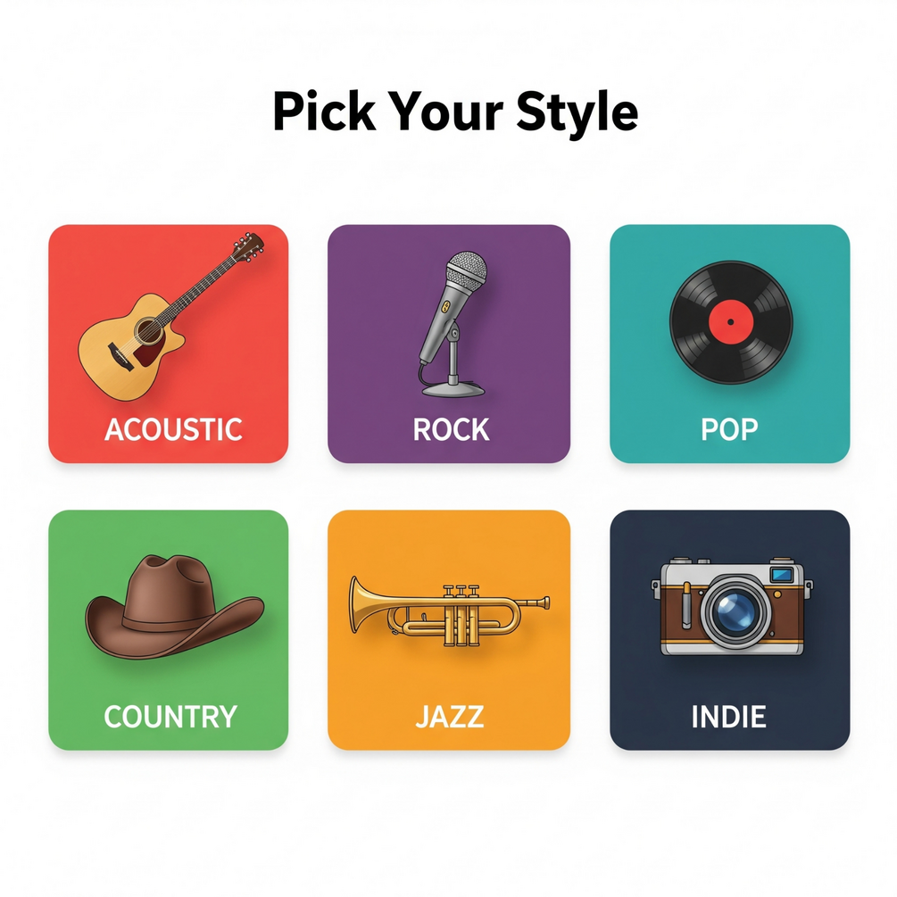 Pick from genres like Acoustic, Rock, Country, Pop, Indie, Folk, Jazz, or a custom blend. Want something fun and light or deep and emotional? I’ve got you.